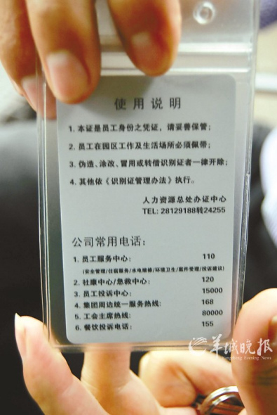 “我们以前也意识到员工沟通难的障碍,因此出台了由内部员工推荐的政策,新人在推荐人的帮助下,能尽快适应公司的环境。新人进厂之后,在他们的厂牌后面都会写明相应的投诉电话,有什么困难可以直接拨打相关的电话。”陈宏方坦承,“这几起突发事件给我们敲响了警钟,让我们反思我们前段时间做的工作是不是不够,反思我们在管理和文化制度上是不是还有不完善的地方。”他说,厂内现在专职的工会人员有15人,兼职的有270人,对于42万人的大厂来说,显然低于国家规定的每1000人配备1名工会干部的标准,因此工会的救助系统推广的力度还不够。