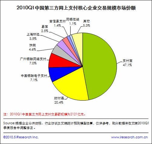 第三方支付在各领域的渗透率逐渐提高,促交易规模稳定增长。2010年第一季度第三方支付交易规模达2121亿元。
