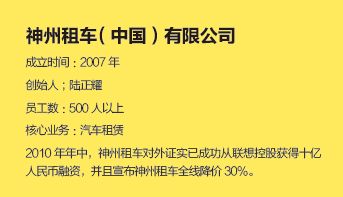 从最初做呼叫中心,然后转而做以呼叫中心为基础的UAA(联合汽车俱乐部),最后转做以UAA为基础的神州租车,陆正耀等于连续创业了三次,在这过程中,投资公司如影随形,特别是在租车这个资金密集型的行业,资本在其迅速成长为行业内规模最大企业的过程中起到了决定性作用。