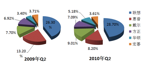 近些年,惠普在中国市场的扩张步伐从未停止,从其个人PC出货量全国第二、2009年PC销售额以40%增幅居业界之首以及近500个服务点遍布各地等数据来看,我们不难想象其攻城略地的野心。然而在其大肆扩张的同时,其市场份额却直线下滑:IDC关于2010年中国PC市场数据显示,惠普市场份额一年间同比大降五个百分点,由2009年Q2的13.2%,降至2010年Q2的8.2%。其中笔记本市额降幅最大,由2009年Q2的19.4%一路下滑至2010年Q2的8.2%,降幅超过10%以上,台式机市额也平缓下降。相反,虽然联想、戴尔等竞争对手表现平稳,但基本保持上升趋势,特别是惠普在中国市场第二的宝座也在本季被戴尔超越,与冠军联想28.7%的差距越来越遥远。