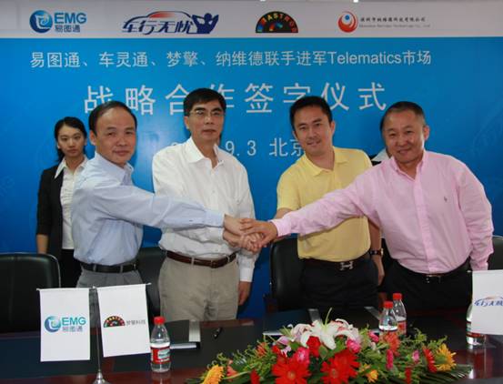 2009年9月3日,易图通科技(北京)有限公司、亿阳集团北京车灵通科技发展有限公司、上海梦擎信息科技有限公司、深圳纳维德科技有限公司等四家企业联手进军Telematics市场战略合作签字仪式在北京举行。易图通原董事长王志钢、车灵通总裁张春辉、上海梦擎董事长叶明通以及深圳纳维德总经理杨涛等一同出席签字仪式并发表讲话。根据协议,导航地图提供商易图通、Telematics的服务提供商车灵通、软件商梦擎及GPS硬件方案商纳维德将在车载信息服务业展开全面合作。业内人士预测,四家企业的联手将为中国汽车信息化的发展起到积极的推动作用。同时,这也标志着作为导航地图专业提供商的易图通正式进军车载信息服务产业(Telematics)。