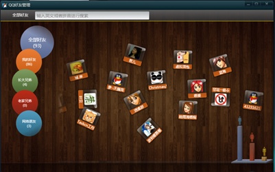 4.好友管理是这次创新过程中用户界面革新变化最大的一个界面,在这里可视化的好友管理,以及便于触摸的操作体验得到了很好的融合。为了让用户有更好的沉浸感,我们用了桌面以及卡片等真实的拟物化场景设计来让用户沉浸在这个控件中。但由于开发时间尚短,好友管理功能不是很完善,我们将使她更加完善。在后续的版本中,更多的去挖掘用户的关系链以及如何去呈现她,通过更加可视的方式进行展示好友的沟通方式会是我们需要去推敲和发展的,好友管理将会更加便捷,敬请期待!