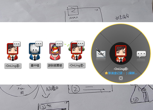 3.桌面好友的拖曳拉出表现,对于男女的表现区分以及会员特性的表现和动态圆盘菜单的展示都体现了视觉创新对用户带来的愉悦以及尊贵感,最早桌面小人如何让用户感受到好友的气息,但又能形成统一的品牌特色,在视觉风格之处也尝试了很多的方案,最终我们以桌面小人为原型展开一系列的创新设计,我们在创新规划的过程中也考虑了如何与桌面好友互动,目前好友在听音乐,小人头像就会头戴耳机晃动,有动听悦耳的音符飘出,你可以快速跟好友快聊等等,后期我们会做更多对与好友互动的沟通方式的尝试,包括游戏状态以及一些更深入的好友动态信息的挖掘。