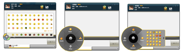 2.圆盘式的表情管理界面,通过颜色的视觉感应,激起用户对表情品牌的识别,也更加方便触摸操作,在底部灰色模块区域,用户近期使用的表情会自动保存,方便用户使用。当然这里空间的分配以及面板的扩展性的设计也是我们下一阶段会去完善的,包括QQ概念版独有的QQ动态表情也会在下一版本做一个统一规划。