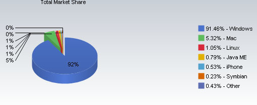 NetMarketShare数据显示,今年4月,Windows市场份额从3月份的91.58%降至91.46%,而去年4月的市场份额为93.45%。