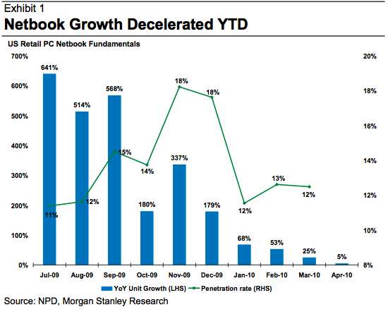 摩根士丹利周四在一份报告中称,苹果iPad已经影响了上网本销量。报告显示,去年夏季,上网本销量涨幅创下了一个高峰,同比涨幅达到了惊人的641%。