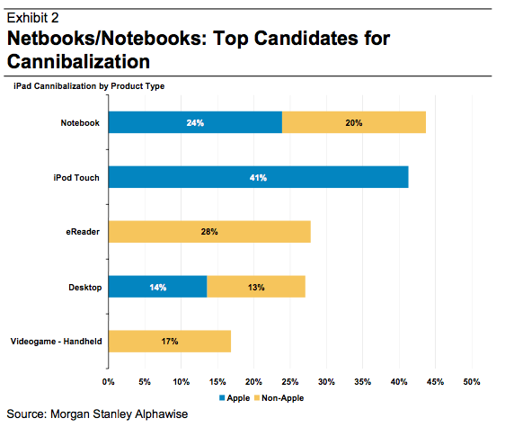 这种解释并非牵强附会,另据摩根士丹利一份调查结构显示,在计划购买iPad的美国消费者中,44%表示不会在购买上网本或笔记本。