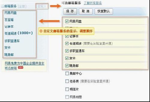 目前,网易邮箱可自定义的服务共有10项,为网易网盘、随身邮、集邮中心、百宝箱、记事本、有道阅读、明信片、贺卡、任务表和网易相册。