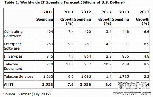 Gartner的研究副总裁理查德·戈登(Richard Gordon)发表声明称:“虽然全球经济所面临的挑战——如欧元区主权债务危机、美国经济复苏进程表现疲弱以及中国经济增长速度放缓等——仍在持续,但前景至少已经稳定下来。在过去一个季度中,商业信心和消费者信心都几乎没有什么变化,因此IT支出的短期前景仍旧值得警惕。”