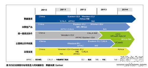 在企业网络领域,华为还是非常新的参与者,并且仍需要几年的时间渗透到全球各个市场中(具体市场发展情况如图所示)。