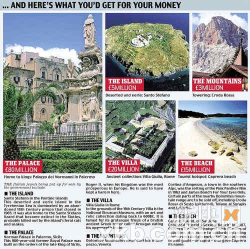 据英国《每日邮报》报道,继希腊之后,意大利政府也将出售国有财产,以募集资金偿还高达1.79万亿美元(约12万亿元人民币)国债。待价而沽的包括大约9000处建筑、宫殿、海滩、岛屿和城堡等总计约30亿欧元(约255亿元人民币)的资产。这些资产将于7月底在网上拍卖。