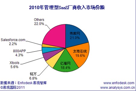 日前,根据易观国际Enfodesk产业数据库中《2010年全年中国SaaS市场季度监测》数据显示,2010年全年中国管理型SaaS市场季度收入达4.45亿。其中,用友伟库以21.0%的市场份额占据榜首,金蝶友商网和金算盘亿禧网分列二三位。来自国际的SaaS服务巨头salesforce显然有些水土不服,仅有2.2%的市场份额,与铭万、800app、XTOOLS位列第二阵营。