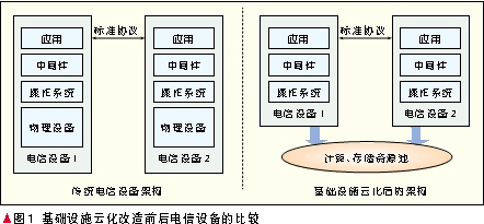 图1显示的是传统电信设备和云化改造后电信设备的比较,明显的区别是传统电信设备的物理设备由统一的资源池代替。