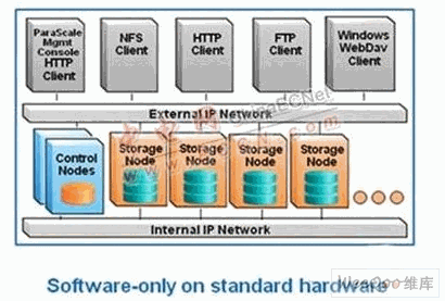上面灰色的方块(NFS、HTTP、FTP、WebDav)是应用端,左上角的灰色方块(mgmt console)是一台PC,负责云存储中存储节点的管理。对应用端看来,云存储只是个文件系统,而且一般来说支持标准的协议,例如 NFS、HTTP、FTP、WebDav等等,所以很容易把旧有的系统与云存储结合,应用端不需要作什么改变。