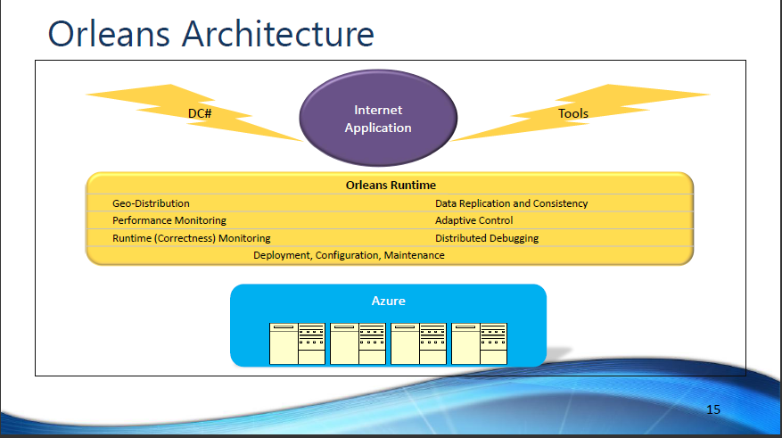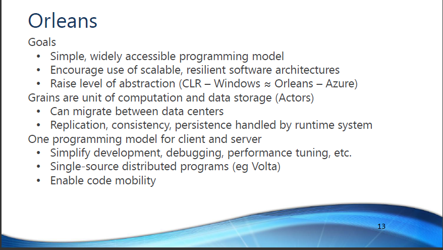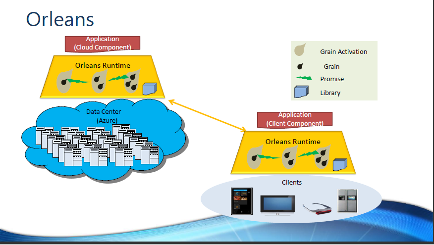 Orleans是一种新的编程模式,用来提升微软通用语言运行库(CLR)的抽象水平,它引入了“grains”的概念,这是一个可以在数据中心之间迁移的计算和数据存储单元。Orleans自身还将提供很多运行时,包括Geo-Distribution、数据复制与一致行、性能监控、自适应控制、运行时监控、分布式调试。