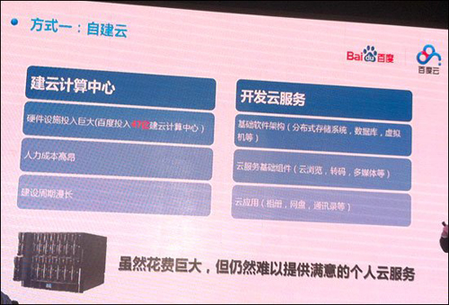 林仕鼎介绍建设云服务三种方式:自建云、租用云、共建云。他指出,自建云具有硬件设施投资巨大、人力成本高昂、自建周期漫长等特点,而且依然难以提供让人满意的个人云服务。