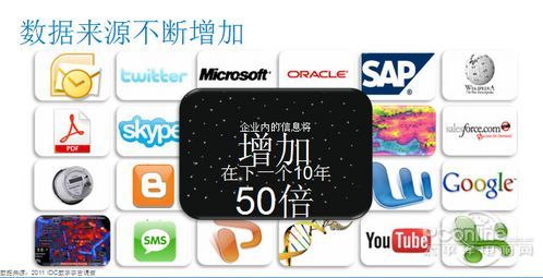 作为数据存储巨头,EMC的大数据理念是,首先从“大”入手,“大”肯定是指大型数据集,一般在10TB规模左右。很多用户把多个数据集放在一起,形成PB级的数据量。同时从数据源来谈,大数据是指这些数据来自多种数据源,以实时、迭代的方式来实现。