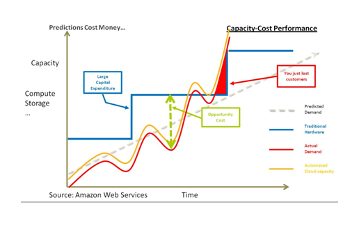 专用服务器公认的平均使用率(真正被使用的时间)是10-15%。我曾跟很多CIO验证了这个数字,大部分都是认可的。这意味着专用服务器在85%的时间里在消耗能源、占据空间和管理资源,但对公司却没有任何实质上的贡献。把应用通过虚拟化从硬件中脱离出来并且允许多个应用在这个虚拟环境下运行可以提高服务器的使用率。亚马逊创建的容量运用曲线也说明了这点,虽然只是着眼于需求的增加,但显然不总是如此。