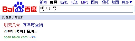 不过比较好玩儿的是,如果在输入框里输入“明天几号”的话,它的搜索结果就有些打折扣了,没有显示详细的日历,只是简单地标明了明天的日期与星期几,从这里也可看出,框计算仍然还没有发展到很完善的程度。