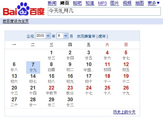 上面两个应用输入的关键词还比较容易辨认,后来小编又利用百度查了一下日期,先后输入了“今天几号”与“今天礼拜几”两种说法,搜索结果都是如下图所示的日历,个人比较喜欢它把农历也一并标出的做法,这样就不用再费二遍事了。