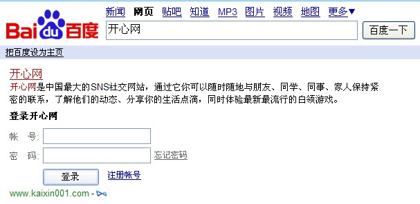 再比如用户要登陆社交网站开心网,这时只需要在搜索框里输入“开心网”三个字,便会出现如下图所示的开心网登陆界面,用户便可以直接输入账号登陆开心网了,而不必像以前,还需要通过进一步点击。