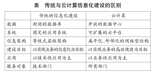 云计算不只是新技术的整合,更重要的是对于建设者而言,云计算与传统的信息化建设有所区别。在传统的信息化建设中,软硬件的购买和运营、维护是信息化很重要的一部分,云计算则将这一部分作为一种服务提供给人们,这更便于人们专注于自己的业务;云在硬件性能上具有一定的弹性,可以面向不同的任务提供更强大的计算能力。具体到教育管理的信息化模式,我们可以看到云计算技术所带来的不同之处,如表所示。