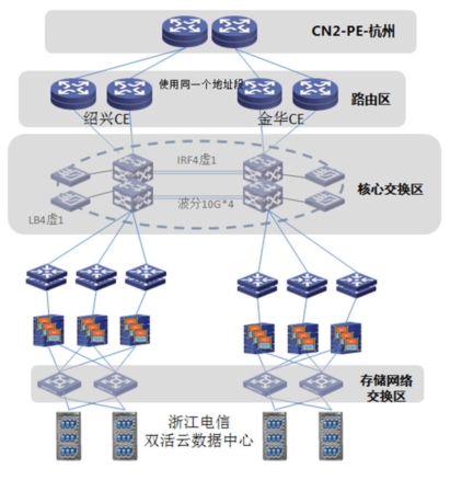 浙江电信业务云资源池双活节点总体网络架构如图2所示。