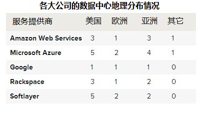 Azure在这方面做得最好,共在12各地区设有数据中心,其次是Softlayer(9个地区),然后是亚马逊(8个地区)和Rackspace(6个地区),最后是Google(3个地区)。