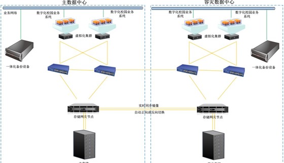 虽然,这个方案具有极高可用性,可以保障业务运行的连续性,但是该方案并没有容灾功能,一旦出现火灾等重大事故,云南农大数字校园系统仍有中断的风险,因而浪潮又利用学校已有的计算设备、存储设备等做了异地数据中心容灾(其中主数据中心在新校区6号教学楼B区205,容灾数据中心在老校区综合楼517),满足了高校信息安全等级保护要求。