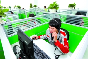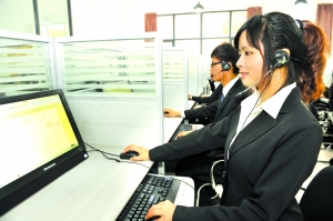 目前,位于观山湖区的贵阳呼叫中心与服务外包产业示范基地已完成一期650个坐席的建设工作,相应的配套设施设备均已到位。图为示范基地大厅繁忙的景象。