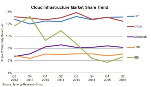Synergy一直在跟踪云基础设施设备市场,它挑选的厂商包括:硬件制造商惠普、思科、戴尔、IBM、EMC、联想和甲骨文,软件供应商微软和VMware,以及其他一些提供构建云或管理云的云软件供应商。