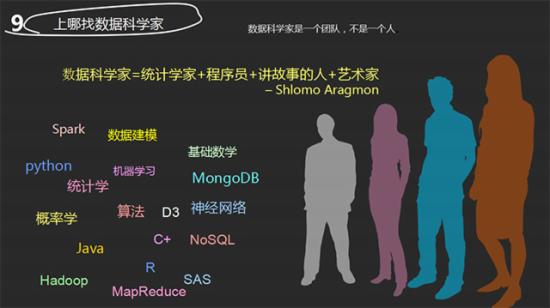 在去年数据分析行业峰会上,我演讲的PPT里有一页是这样写着的:数据科学家=统计学家+程序员+讲故事的人+艺术家 –Shlomo Aragmon。没错,大数据行业是个复杂的新兴行业,你永远有学不完的知识,而且跨度还很大。因为要学的东西很多,那么如何选择呢?当然还是选择自己喜欢的感兴趣并且用得上的知识点。当然了,目前大数据行业从业人员还停留在打怪升级阶段,这一阶段暂时还不用着急考虑。先做自己能做并且想做的事情,先学自己工作中必须用到的技能。