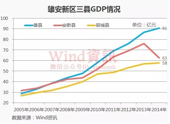 从经济发展水平来看,三县的GDP相差不大,雄安县相对较高2014年达到91亿元,安新县和容城县分别为63亿和58亿。从县域经济来看,三地和全国多数县经济表现相差不大。