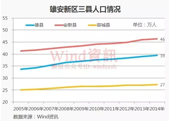 统计数据表明,雄安新区总人口仅100多万。2014年统计数据显示,雄县人口39万、安新县46万、容城县27万,近年来人口增长均较为平缓。