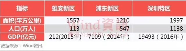 Wind资讯统计,雄安新区所辖三县总面积在1557平方公里,介于浦东和深圳之间,但在人口和GDP方面则有非常大的差距,人口规模只有浦东的五分之一,深圳的十分之一;GDP仅占浦东新区的3%,深圳的2%左右,可谓是云泥之别。