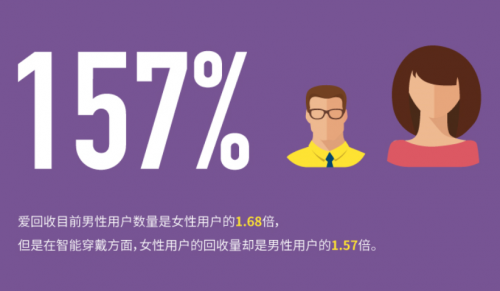 根据爱回收大数据研究院提供的数据,爱回收目前男性回收量是女性的1. 68 倍,但是在智能穿戴方面,女性用户的回收量却是男性用户的1. 57 倍,侧面反映了智能穿戴是更符合女性群体审美和需求的数码产品。