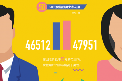 本次爱回收大数据研究院提供的数据为大家带来了更多新鲜元素,其中包括回收金额处于 50 元以下价格段的女性和男性用户量对比。