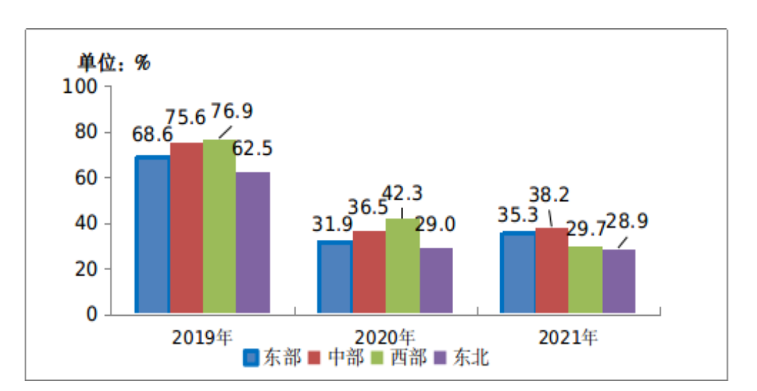 如下图所示,2019-2021年东、中、西、东北地区移动互联网接入流量增速情况