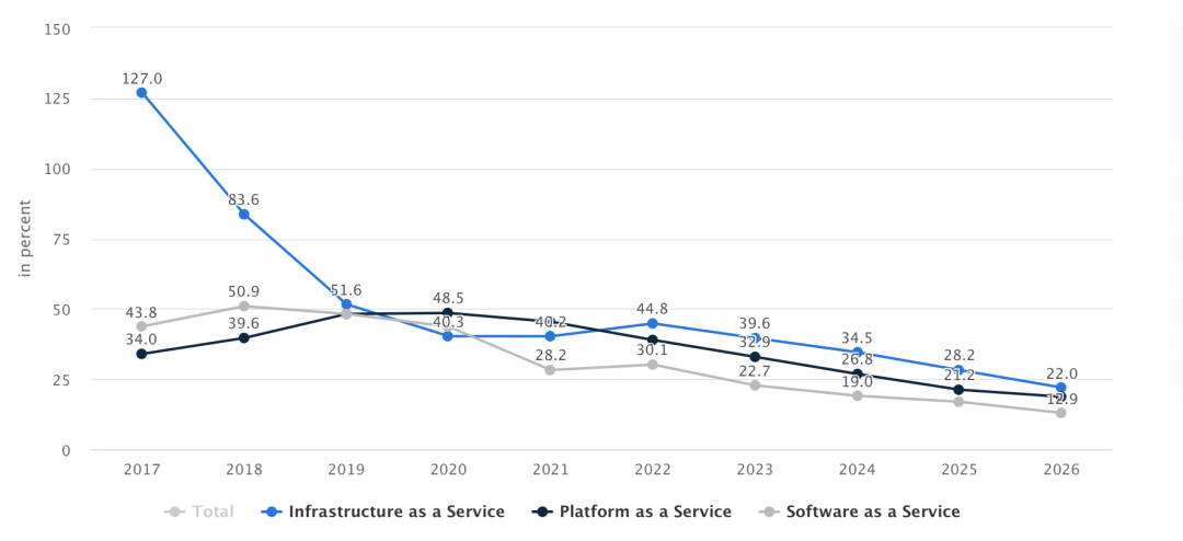 但在现实中,SaaS的发展并未尽随人愿,下图是statista网站根据公开信息整理的我国云计算分类别增长情况。