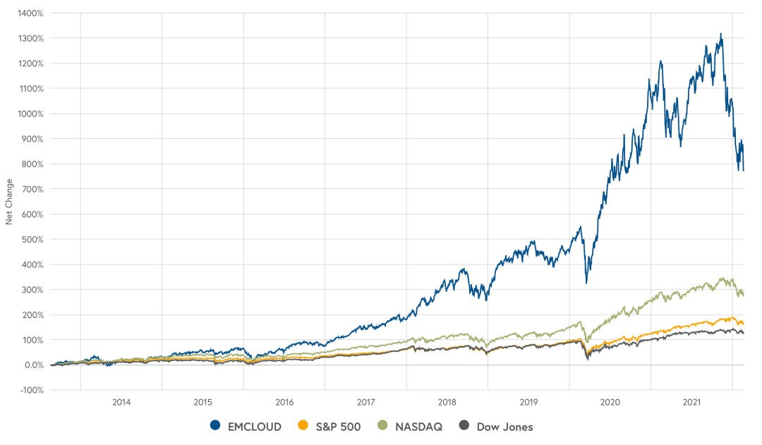 此潮流在2021年第四季度急转直下,尤其在美联储宣布Taper之后,虽然美指仍然保持了稳定和小幅的上扬(2021年内),但过往高估值的云计算板块却遭受了一轮重击,腰斩企业已非少数,最近市场中也鲜有唱多云计算的声音,行业又弥漫着一股悲观之气。