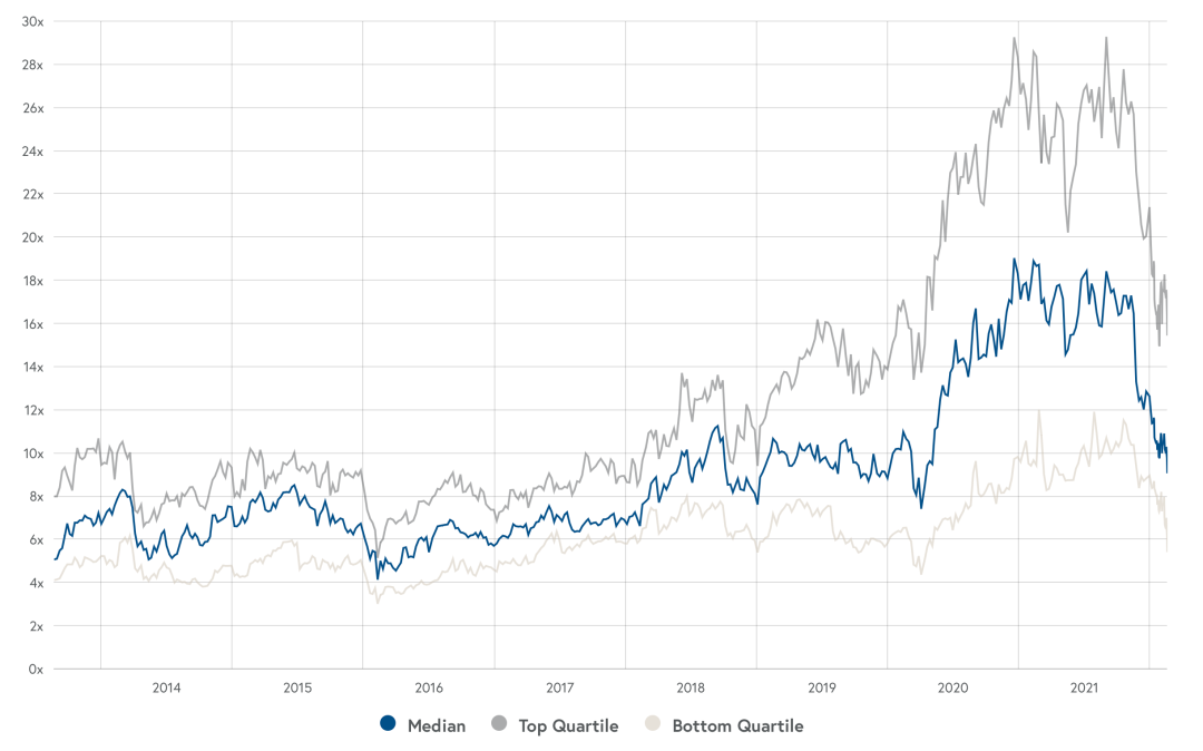 若以2018年市场调整为参考,可以发现除头部企业营收倍数略高之外,其他两类企业估值水平基本回归到了2018年末水平。如前文所述,随着货币政策的调整,资本市场的估值逻辑会随之进行调整,且目前大致回到了历史低点水平,这究竟意味着什么呢?