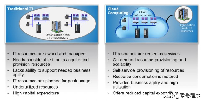 而使用云计算,公司则租用云服务上的IT资源(如存储、计算、网络带宽、应用等),而无需自购软、硬件资源。 云计算资源支持按需供应,具备可收缩性。 通过云服务上提供的门户,用户可自动化的实现IT资源的租用。同时,云计算服务中消耗的资源,可以通过计量服务来测量,从而按消耗量对用户进行计费;当用户不再需要资源时,用户可以轻松取消租用的资源,这减少了对用户对于IT基础设施的投资,提高了资源的利用率,同时还减少了这些IT基础设置管理、用地、用电、制冷等相关的费用。此外,用户减少IT的维护任务,可以推动他们对新业务计划、新市场的发现和创新。