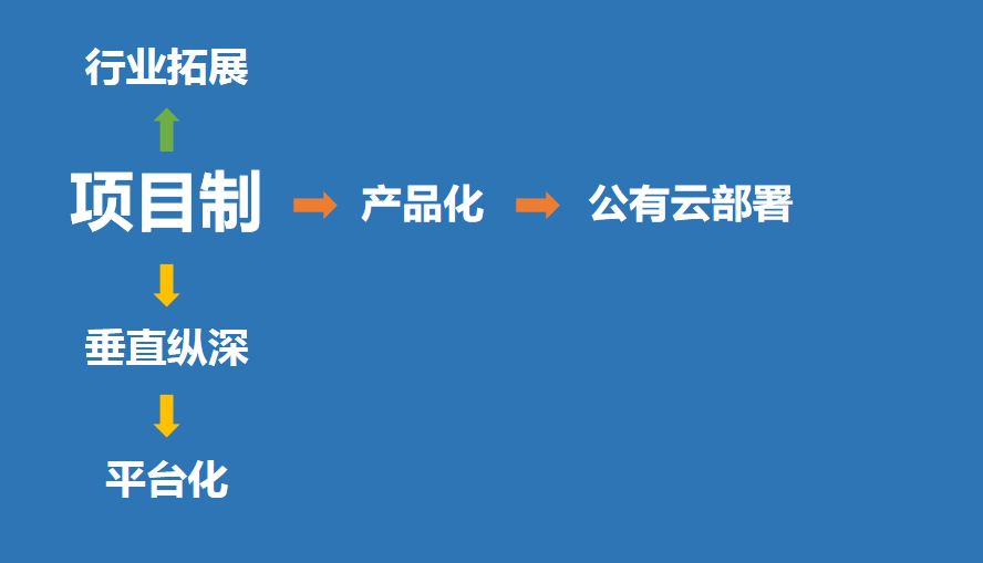 目前国内AI产业主要有三条演进路径,从项目制出发:一条是最难获取高利润的多行业拓展模式,为了快速铺大摊子、做大规模,或者寻求业务突破而进入到金融、医疗、零售等数个领域,多线作战;一条是专注于一个垂直行业,把方案和服务做深做透,进而寻求在某一领域里实现平台化;还有一条是先聚焦于算法的打磨,做好算法的产品化,再依托云平台将算法对外服务,并用云平台的基础设施能力帮助企业研发算法。