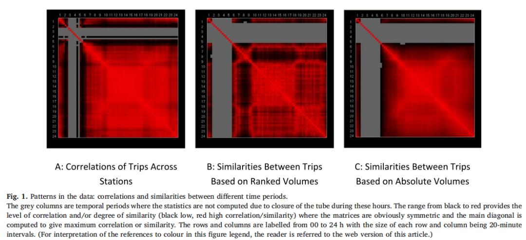 图1显示了任何一对时间段的概况。图1(A)显示了任何一对时间段与所有站点的行程量之间的相关密度。在这里,我们根据交通量的等级重新排列了这些剖面,然后将其作为每个时间段车站的每对排序剖面之间的归一化差异进行比较,如图1(B)。在图1(C)中,我们计算了相似性的集。从图1(A)中看出,第一组(早高峰:7:00-9:00)存在高相关性,即所有站点的运量与每个站点的相关性都相当高。第二组(10:00-15:30) 存在类似时段,但总行程和总数量大幅度减少,矩阵仍然在时间模式上而不是在总体体量上显示出相似性。第三组(晚高峰: 16:00-19:00)也出现了相似但更清晰的模式。
