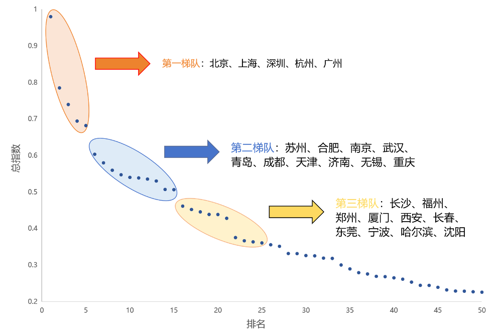 从城市排名结果看,我国大数据产业发展格局基本保持稳定,优势梯队继续领先,新兴梯队快速成长。北京、上海、深圳、杭州、广州五个第一梯队城市连续五年稳居全国前5,优势突出,综合实力强大;第二梯队展现出快速发展的势头,地方特色突出,依次为苏州、合肥、南京、武汉、青岛、成都、天津、济南、无锡和重庆;第三梯队发展潜力十足,主要包括长沙、福州、郑州、厦门、西安、长春、东莞、宁波、哈尔滨和沈阳。