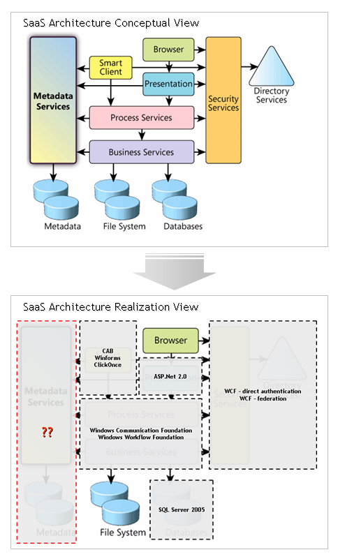 上面这幅图的上半部分给出了SAAS参考体系结构的一个概念模型,下半部分则给出了对应于体系结构的每一部分,现有的可能采取的技术手段。我们注意到,元数据服务和元数据数据结构定义是里面唯一的盲区。
