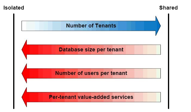 关于这一部分,MS在其白皮书中的第二章《多用户数据体系结构》中已经有了比较详细的交待,本文中就不再重点介绍。可能采取的数据结构有:(1)独立数据库;(2)共享数据库,不同用户有不同架构;(3)共享数据库,共享架构。一共是三种方式,这三种方式的资源利用率越来越高,但在设计上也越来越复杂。所以,也并不是共享的程度越高越好,下面这幅图说明了如何在数据库的独立和共享性上面做以取舍: