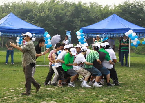 现场学生(其中一组)在做拓展小游戏