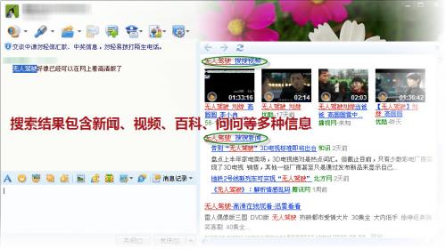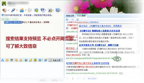 在“划词搜索”的搜索结果里,综合了搜搜网页搜索的特色,不仅提供新闻、视频、百科、问问等垂直搜索结果,更提供预览功能。在QQ对话框的方寸空间里,在与好友交谈的分秒瞬间,即能通过划词搜索全方位了解资讯,让话题源源不绝。
