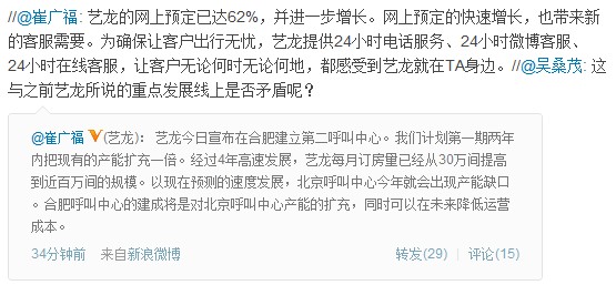 崔广福在微博上说:“艺龙的网上预定已达62%,并进一步增长。网上预定的快速增长,也带来新的客服需要。为确保让客户出行无忧,艺龙提供24小时电话服务、24小时微博客服、24小时在线客服,让客户无论何时无论何地,都感受到艺龙就在TA身边。”